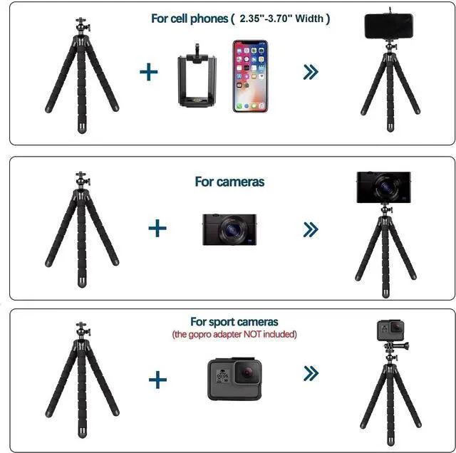Universal CompatibilityIt comes with an adjustable spring-loaded phone clip that can accommodate iPhone series and Android smartphones up to 3.75 inch wide. By a standard 1/4" adaptor screw thread, it is compatible with webcams, sports cameras and small digital cameras like Nikon/ Canon/Sony. (GoPro Adapter is NOT included. )