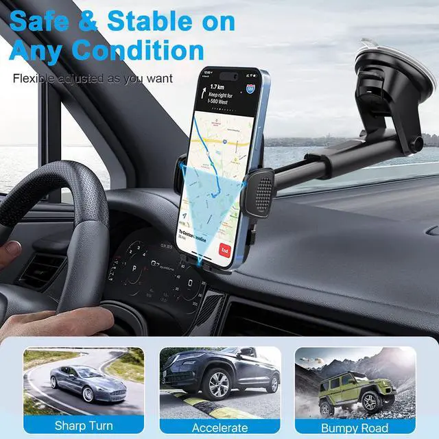 Keep your phone secure and accessible while driving with this adjustable car phone mount. Designed for safety and convenience, it features a one-touch locking system for quick and easy mounting. The strong suction cup base ensures a firm grip on both dashboard and windshield surfaces, even on rough roads. With 360-degree rotation, you can adjust your phone to the perfect viewing angle for navigation, calls, or music. Compatible with most smartphones, this mount provides a stable and reliable hands-free experience for everyday driving.
