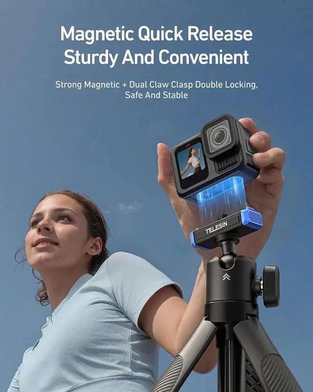Double Security & Magnetic Quick ReleaseThe selfie stick tripod features a strong magnetic base and a sturdy metal clamp for double the security, keeping your camera stable and safe. With easy one-touch installation and removal, you can quickly switch setups and stay ready for any shooting scene \u2014 ideal for improving both efficiency and shooting experience.
