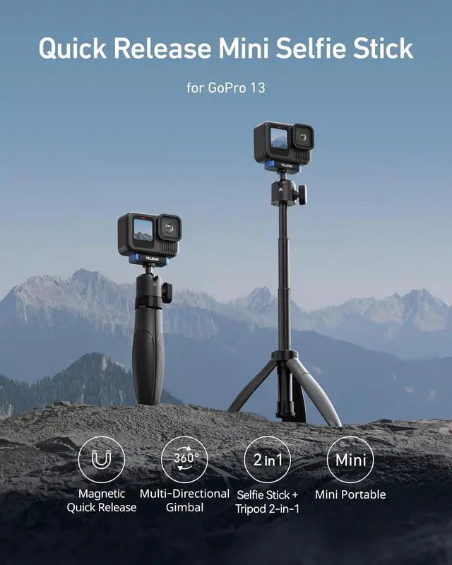 Selfie Stick Tripod for Gopro Hero 13This is TELESIN Mini selfie stick tripod, only compatible with the Gopro Hero 13 (Note: Not compatible with other models). It's an ideal shooting companion for vloggers, travelers, and outdoor adventurers alike.