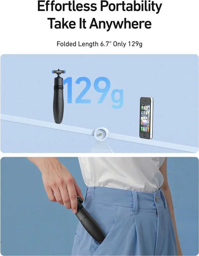 Adjustable Extension Mini Selfie StickThis mini tripod stand has a 4-section telescopic design and can be adjusted from 17cm - 40cm (6.69" - 15.7"). You can easily use it for handheld selfies, wide-angle shots, or as a small desktop tripod. It weighs only 129g. It\u2019s lightweight yet strong, thanks to its aluminum alloy and durable ABS plastic build. The soft silicone handle grip is comfortable to hold and won\u2019t slip, making it great for long-time use.