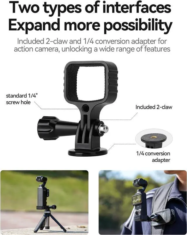 Designed for D-J-I Osmo Pocket 3Includes two interfaces, dual-jaw interface for sports camera and included 1/4 adapter to expand more possibilities for D-J-I Osmo Pocket 3.