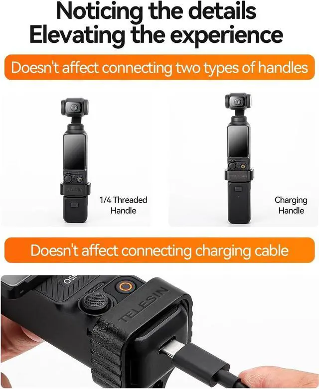 QUICK & SAFE INSTALLATIONMetal telescopic bracket frame won't interfere with the connection of the two grips or the charging cable, built-in non-slip silicone pads help you lock the gimbal more tightly and prevent scratches.
