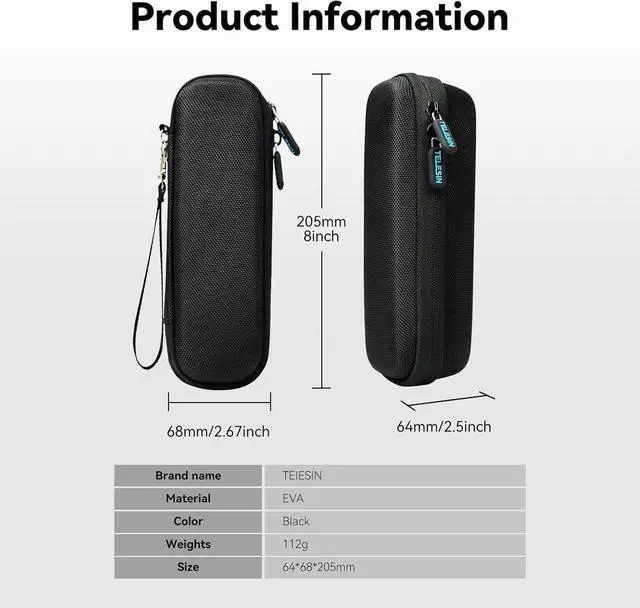 Size is 205*64*68 mm/8.07*2.52*2.68 inch. With mesh divider for carrying SD card and battery charger cable.
