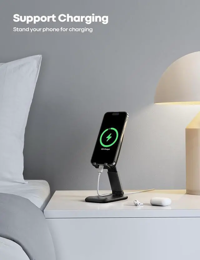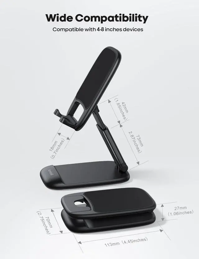 Wide Compatibility - Universal table phone holder works for telephones and tablets between 4 - 8 inches, such as Apple iPhone 17, iPhone 17 Pro, iPhone 17 Pro Max, iPhone 17 Air, iPhone 16, iPhone 16 Pro, iPhone 16 Pro Max, iPhone 16 Plus, iPhone 15, iPhone 15 Pro, iPhone 15 Pro Max, iPhone 15 Plus, iPhone 14, 14 Pro, 14 Pro Max, 14 Plus, 13, 13 Pro, 13 Pro Max, 13 Mini, 12, 12 Pro, 12 Pro Max, 12 Mini, 11, 11 Pro, 11 Pro Max, XS, XS Max, XR, X, 8, 7, 7 Plus, 6, 6 Plus, SE, SE2, android, Galaxy S22, S22 Ultra, S21 Ultra, S21, S20, A72, A71, A52, A5.