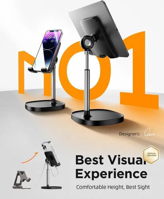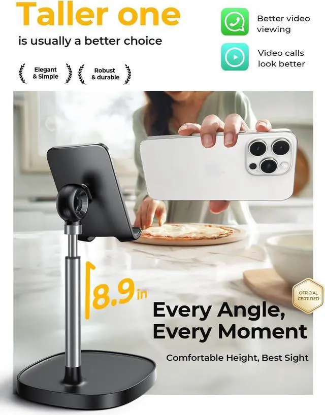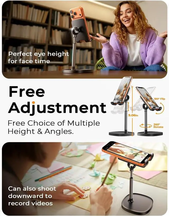 Ergonomic & Adjustable Design: Fight " text neck" and improve your posture with LISENs taller, photogenic phone stand. Designed for comfort, it offers an adjustable height ( 7.1 in- 8.5 in) ( 1.4 in adjustable range) and angle (5°-85°) best phone holder for video recording