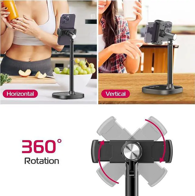 Adjustable Angle: The phone mount of this phone stand holder can be rotated and adjusted 360°, so your phone can be switched between horizontal and vertical screens at will. There is also a front and rear tilt adjustment angle of 180°, you can easily adjust to a comfortable angle in any situation, which is convenient for viewing every time, helps to fix posture and reduce neck and back strain.