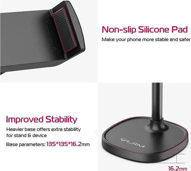 High Quality: Our desktop cell phone stand is made of aluminum alloy and plastic for better stability and durability. The large metal base is heavy enough to ensure the stability of the phone. In addition, there are rubber pads on the stand clip to avoid scratching your phone. The non-slip silicone on the back of the base protects your desk.