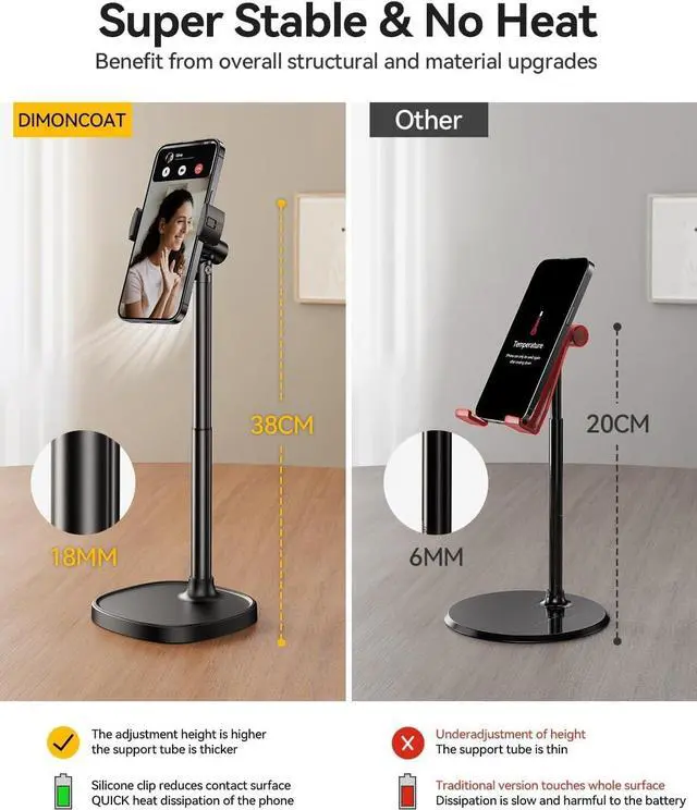 THICK CASE FRIENDLY: DIMONCOAT iPhone holder for desk upgrade silicone clip, It completely solves the problem that the traditional phone holder stand is easy to fall and break the phone. This cell phone holder work for phone with thick case up to 0.75 inches thick. The enlarged & thickened anti-slip & anti-scratch silicone mats on the clamp protect your mobilephone from sliding and scratching. Durable materials and the high-precision smooth surface prevent this phone stand from scratch and break even after long-term use.