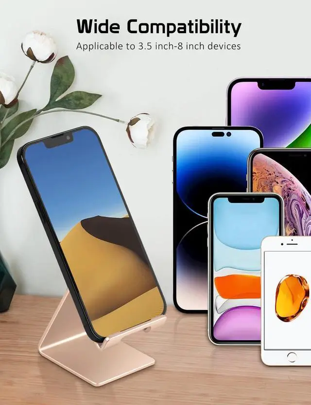WIDE COMPATIBILITY: Our desk cell phone stand is compatible with iPhones and Android phones ranging from 4 to 8 inches, including iPhone 6, 6S, 7, 8, X, Plus, 12, 13, 14, 15, 16 and 17, as well as HUAWEI, Galaxy S7, S6, S8, Note 6, 5, LG, Sony, and Nexus, even when they are in cases