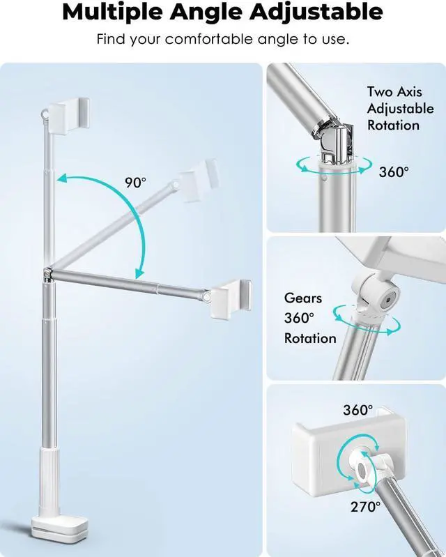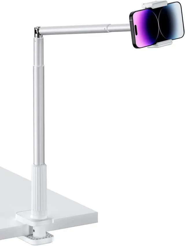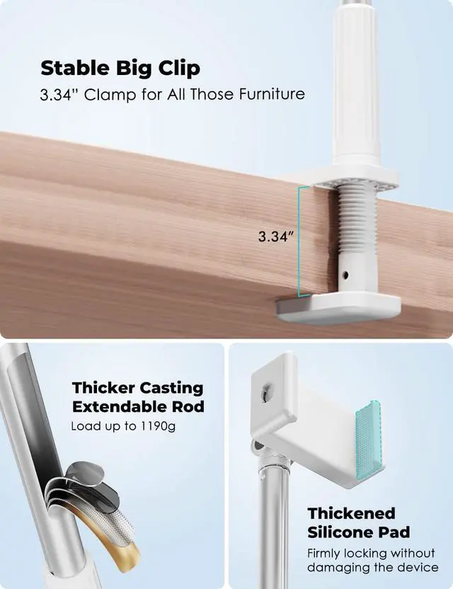 360° Adjustment & Wide ClampThe mobile phone clip of the viozon bedside stand can be rotated freely 360 degrees, and you can adjust the stand to any angle that is most comfortable for you. The main pole can be bent at 85°, you can clamp the stand on the table, and shoot the desktop from directly above, which perfectly meets the requirements of overhead shooting. The clamping range of the C clamp is 0~ 3.34 " (0~ 8.5 cm), and it can be clamped in various places such as bed boards, headboard, nightstand, tables, window sills, sofa tables, dining tables, kitchen counter, etc
