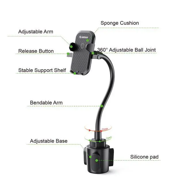 The Esoulk Universal Cup Holder Car Phone Mount features a sturdy expandable base and an adjustable long neck to keep your phone secure and within easy reach while driving. Designed to fit most vehicle cup holders, this mount offers stable, hands-free access for navigation, calls, and media without blocking your view of the road.