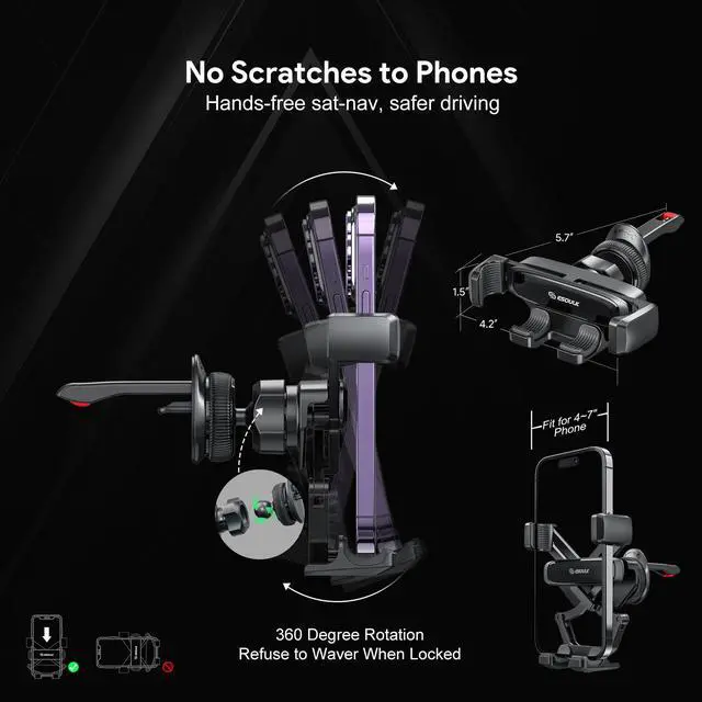 This car vent phone holder mount is designed as "Hook shape" and form "Three grasp points" which can firmly hook around the a/c vent for no slippage or movement. This car vent clip solving the market's common problem of falling forward and off the air vent constantly when going over bumps or turns. NOTE: THE LENGTH OF CLAMP BETWEEN 0.5-1.41IN. THIS VENT CAR PHONE HOLDER NOT COMPATIBLE WITH CIRCLE AIR VENT