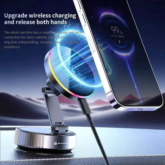 Vibrant Ambient Lighting: Featuring an upgrade ambient lighting design, the circular charging pad glows with a spectrum of colors. This not only adds a futuristic aesthetic to your car's interior but also makes it easier to locate the mount in low-light conditions.