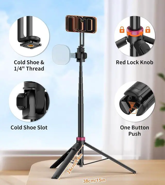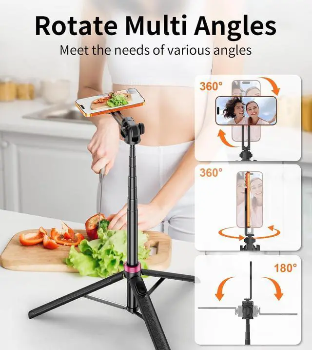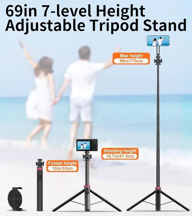 The selfie stick tripod is a great companion for taking photos and vlogging for travel or daily life. [Premium Quality Materials] The magnetic phone tripod is made of high-quality aluminum alloy and nylon reinforced fibers. This advanced material combination achieves the excellent balance of light portability and solid stability make the selfie stick for android lightweight and long-lasting. The telescopic rod slides smoothly maintaining durability and stability without deformation or rusting. The handle adopts an ergonomic design providing a comfort grip for shake free photo and vlogging. [360° Rotation & Adjustable Height] This extendable cell phone tripod can securely locks at any height from 13 to 69 by pulling the telescopic rod perfect for everything from low-angle shots to overhead perspectives.