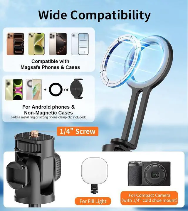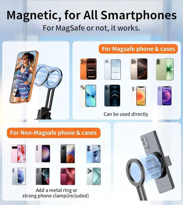 [Magnetic Phone Holder] This tripod for MagSafe features a powerful magnetic phone holder that seamlessly connects to MagSafe-compatible devices providing a stable clip-free magnetic experience. It truly achieves instant stability with a single magnetic attachment. Designed specifically for MagSafe functionality it is perfectly compatible with iPhone 12-17 series. It attaches directly without the need for metal plates allowing you to easily capture every wonderful moment. [Phone Mount for All Phones]This innovative phone clamp is compatible with all phones from 4.7 to 7 inches. Regardless of whether the phone or case is magnetic it can easily attach to any magnetic stand via its built-in metal ring.