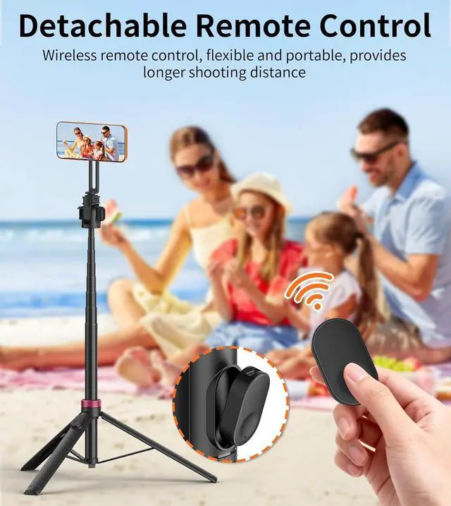 The 360° rotating cell phone stand allows seamless switching between vertical and horizontal modes helpingg you find the perfect professional shooting angles. The stable base of camera tripod ensures crisp shots even on desktops or uneven ground. [Wireless Remote Control] The included detachable remote pairs instantly with your phone enabling hands-free shooting from up to 10m away. The selfie stick for iPhone with remote is perfect for group photos travel vlogs and time-lapse photography providing excellent flexibility and convenience. Featuring modern fast charging it offers long standby time on a single charge. Meanwhile the remote securely stores in a dedicated compartment on the handle to minimize the risk of loss.