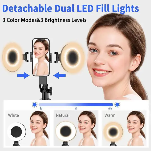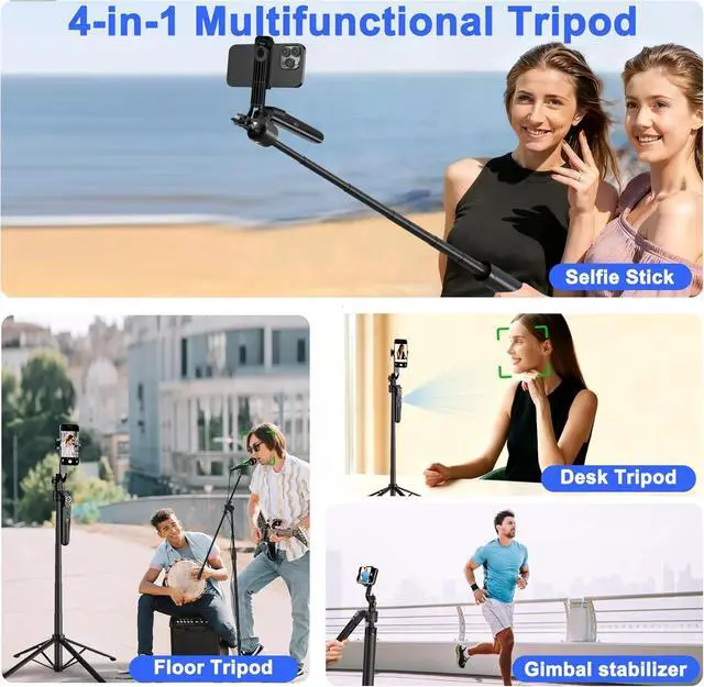 Selfie Stick Tripod: This selfie stick tripod with fill light easily converts into a selfie stick desktop tripod handheld stabilization and floor tripod. The tripod that follows your movement includes a detachable phone holder that can be rotated for front and rear shooting. The included phone holder is adjustable in width accommodating smartphones from 2 to 4 inches including iPhone and Android devices360 °Rotation and