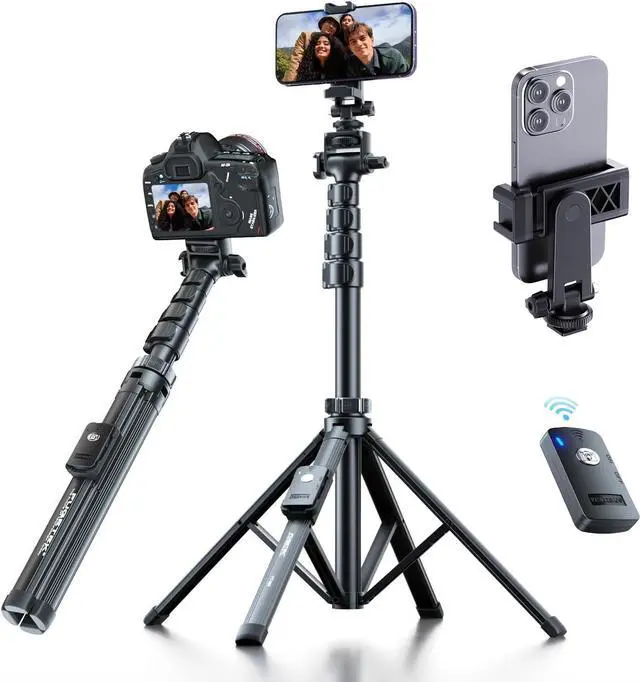 HIGH-QUALITY BLUETOOTH REMOTE: Take Photos & Videos Up To 100 Feet Away An Industry High. NEW Simple One Button Operation. iPhone & Android Compatible. Remote Can Be Pressed 100 000 Times. Remote Standby Time Is 3-5 Years. MEGA EXTENDABLE TELESCOPIC LENGTH AT 62: Maximum 62 Extension 64 With Phone Mount Attached. For Unique Photos & Videos. Easy Click Locks 2 Cold Shoe Slots 1 Cold Shoe Mount For Quick & Secure Use. MULTI-ANGLE ROTATION FOR CREATIVE SHOOTING - Choose Horizontal Or Vertical Camera Modes With 360° Phone Holder Rotation. Allows For The Best Shooting Angles And Capturing Beautiful Photos. 2 cold shoe slots for Mic and fill Light; 1 cold show mount for DSLR. Friendly Customer Service From Houston TX Since 2006.