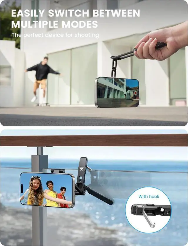 Design: This mini tripod for iPhone seamlessly adapts to your shooting style. Use it as a stable bedstand desktop stand extend it into a full-length selfie stick or switch to handheld mode for dynamic low-angle shots. Its unique mantis hook can securely grip onto railings chair backs and tray tables. This tripod covers all your needs from professional filming to everyday moments.