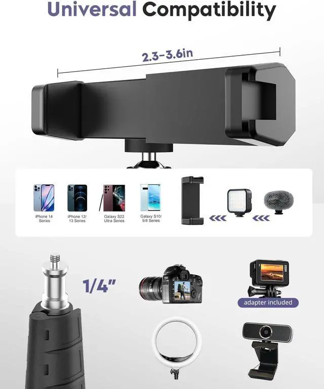 Wide Compatibility: The adjustable phone clamp extends from 2.8 to 5.7 inches accommodating all iPhone and Android smartphones. The tripods standard 1/4-inch screw mount is also compatible with various devices including DSL