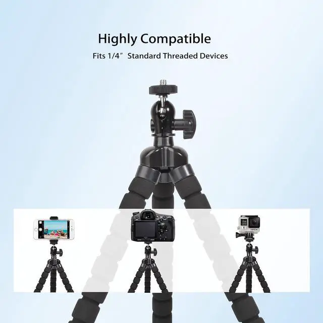 Universal Compatible: This phone tripod features with 1/4 screw on the top and once the ball removed from the joint you will see adapter for Go Pro or sports camera. So you can mount different device onto it as long as its not heavy like smartphone actions camera lightweight camera webcam projector.