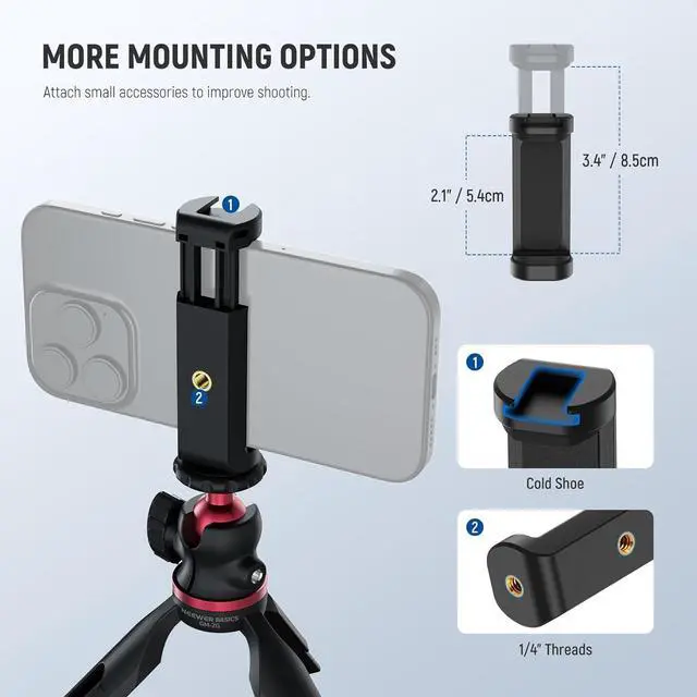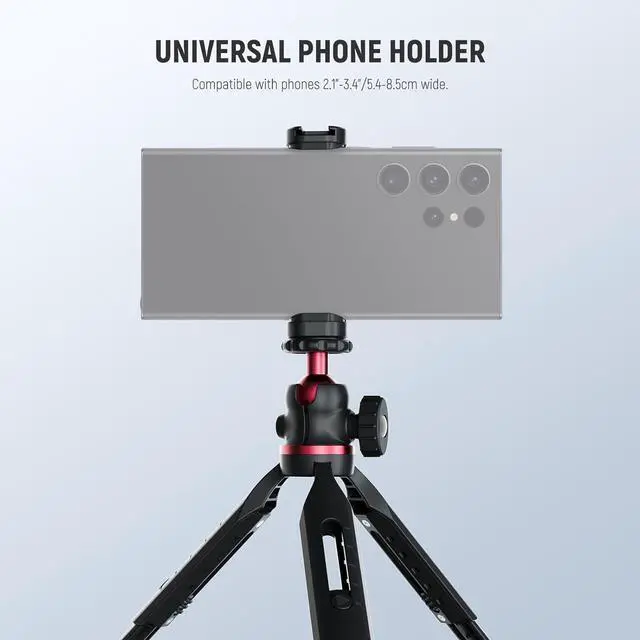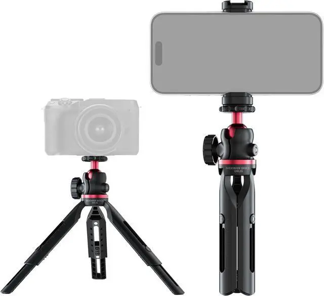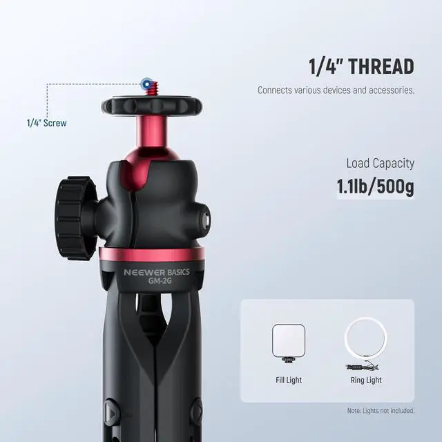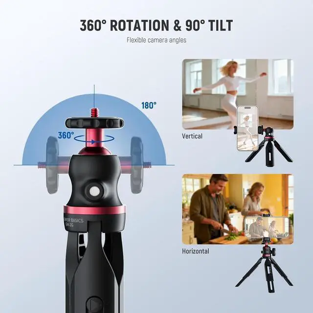 Introducing NEEWER ENTRY LEVEL VERSIONEven simpler than BASICS NEEWER ENTRY LEVEL VERSION is designed with ultimate simplicity and affordability in mind perfect for absolute beginners who only need the most essential functions without any complexity or extrasMini Desk Selfie Stick Tripod Extend the selfie stick to use it as a tabletop tripod or handhold it as a stabilizing grip for a quick switch between grip and stand modes. Made of aluminum alloy and plastic the lightweight small pocket camera phone tripod supports your smartphone (cellphone holder is included) up to 1.1 lbs (500 g). At 8 oz (228 g) and folding to 3.15 /8cm the stand is for outdoor shooting travel videos or filming on the go360° Rotation & 90° Tilt The single U notch design on the all metal ball head enables the 360° horizontal and 90° vertical rotation in a flexible yet stable way suitable for overhead low angles vertical and horizontal shooting ideal for vlogging live streaming travel video recording filmmaking creation as content creator essential and influencer must have adjustable desk standing tripod stand phone holder compatible with iPhoneOne Button Press for Height Adjustment The mini tripod features a hidden telescopic design that extends its legs 0.8 /2cm more for creative possibilities.