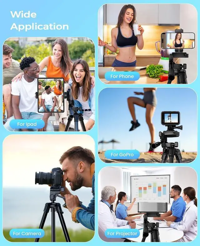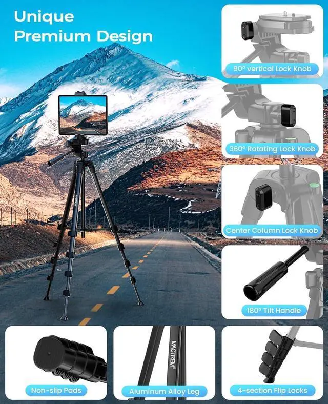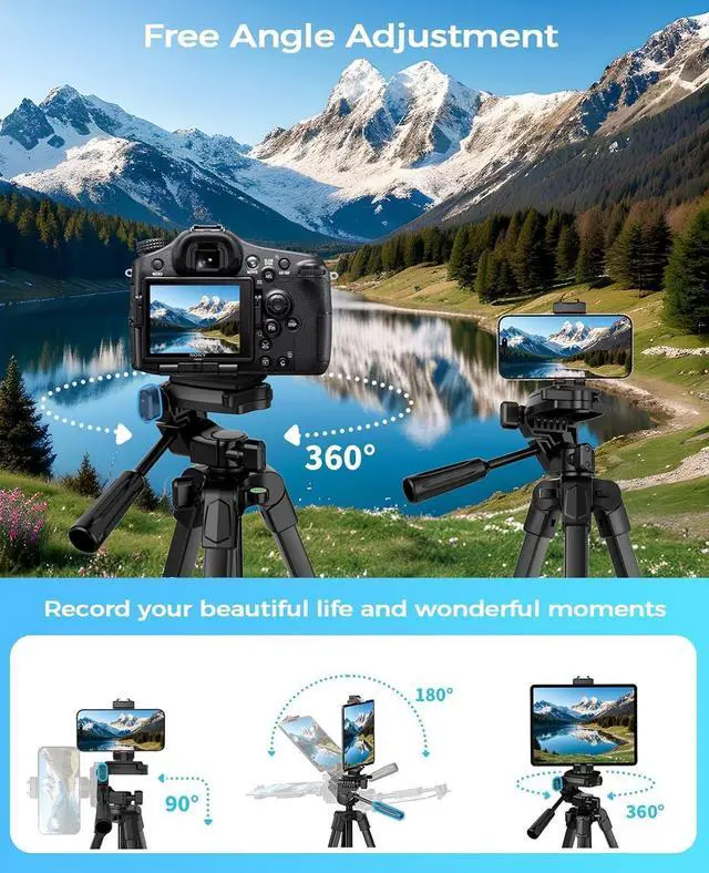 Compatible with smartphones cameras and tablets its the ultimate choice for photographers vloggers and family gatherings ensuring your content creation and live streaming are top-notch. Lightweight and DurableExtendable from 17.7 to 67 inches our tripod for iPhone iPad stand is perfect for various photography heights. Crafted from high-quality aluminum alloy its sturdy yet lightweight at just 1.6 lbs making it ideal for travel and outdoor use providing stable and secure support even on the roughest of terrain. Plus It features built-in bubble view levels for balance and a 360° rotatable 3-way pan head for capturing wide-angle shots.