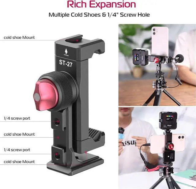 Metal Phone Tripod Mount: 360° rotation smartphone holder with 2 side cold shoe and 1 back cold shoe & 1/4 Expand Hole Design you can attach additional LED light microphone or other film device. It helps you film steady vlogging video for Facebook Youtube and platforms as well as live streaming channels.?? Back Cold Shoe & Two 1/4