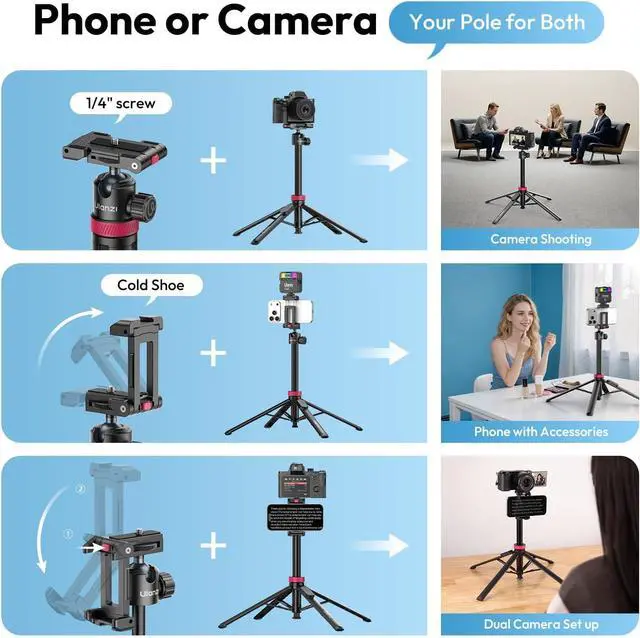 • ULANZI [0.01s Auto Open] Phone Tripod 59 Extendable Selfie Stick Tripod w [Dual Camera Set up] MT-44B 360° Ball Head Cell Phone Stand w Cold Shoe for iPhone 17 Pro 16 Vlog Family Gatherings