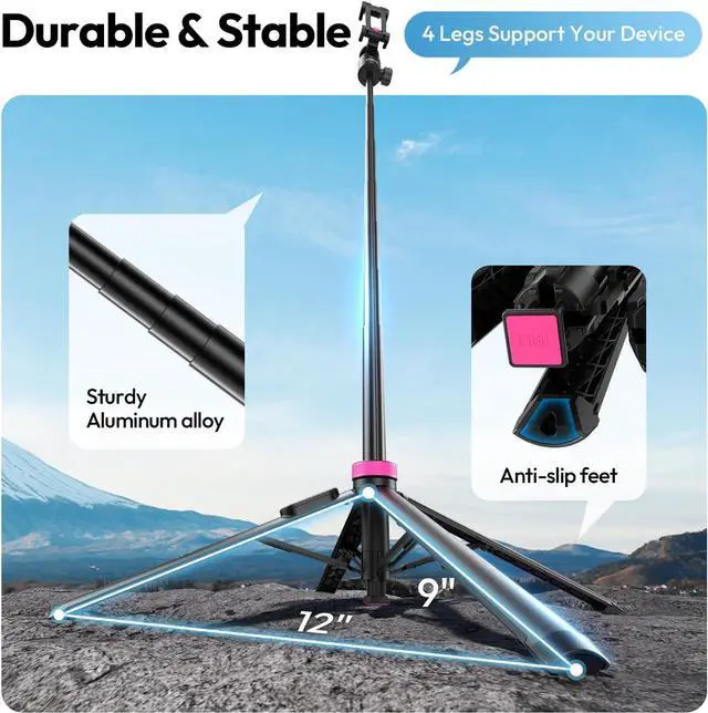 Magnetic Phone Tripod: Compared with ordinary tripods this upgraded model adopts a four-leg support structure. The non-slip silicone feet enhance stability on various surfaces even uneven ground during outdoor activities. Combined with the magnetic phone clamp for secure attachment this Extendable Phone Stand ensures your devices stay steady when shooting long-exposure photos or outdoor scenery. Flexible Rotatable Ball Head Selfie Stick: Built with a 360° rotatable ball head and adjustable knob it supports free switching between horizontal and vertical shooting. You can easily adjust the angle to capture the best view whether for landscape photography during hikes or daily selfies with friends. This Magnetic Phone Tripod adds more flexibility to your creative shooting.
