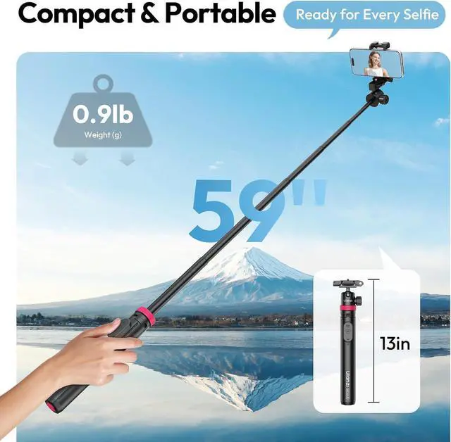 Portable Extendable Phone Stand: Folding down to only 33cm and weighing 415g (about a bottle of mineral water) this upgraded Selfie Stick is easy to store in your backpack or handbag. Its an ideal companion for travel hiking or daily commuting. The lightweight design reduces your carrying burden allowing you to take it anywhere for instant shooting needs.