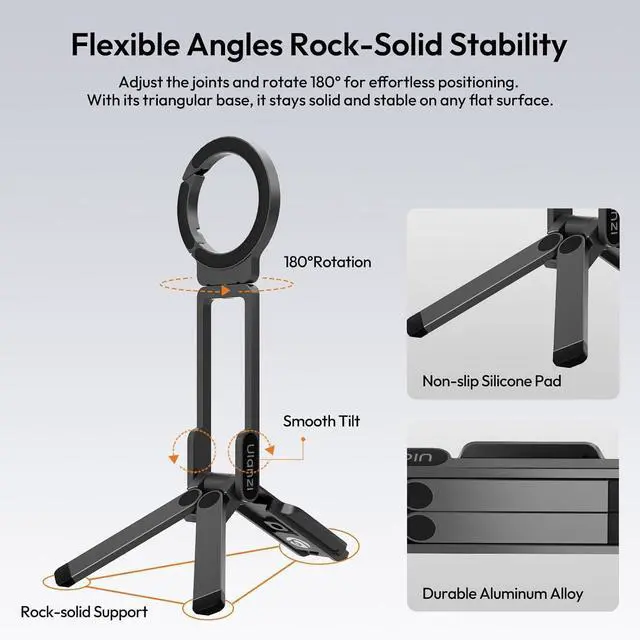 Level Up Your Shots with 5 ModesThis Ulanzi magnetic tripod a versatile mini tripod offers 5 shooting modes. It works as a desktop stand for steady viewing a handheld selfie stick for on - the - go snaps or a mantis - hook mount for unique angles. Perfect as a magsafe phone stand it adapts to vlogging live - streaming and more catering to all your creative needsPatented Quick - Clip Design for PortabilityPatented Quick - Clip Lightweight Carry Featuring a patented quick - clip design this magsafe tripod is ultra - portable. Its compact foldable structure (a small phone tripod) slips into pockets or bags with ease.