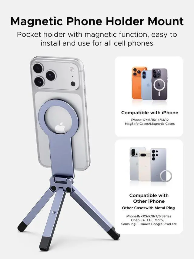 Compatibility: Designed for seamless integration this magsafe tripod is fully compatible with iPhone 12-17 series and MagSafe cases. The included adhesive metal ring extends secure stable mounting to Android phones and standard cases ensuring a premium experience for every deviceNote: It is suggested to stick the metal ring on the back of your phone case press it firmly for a few seconds and let it stand for 24h before using