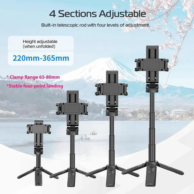 Important Stability Instruction: To prevent tipping especially with heavier phones always extend the legs fully and lower the center column to create a stable four-point base on a flat surface. Compact & Portable Design Weighs approximately 116g ( 0.26 lbs) and folds down to a compact size for easy portability. The product is designed for convenience during travel. Remote Control EffortlesslyAllowing photo taking from distances of up to 10 meters away by yourself. (lf connectted failing clear the original Bluetooth options and restart again. )Compatible with Androind & iPhone series not compatible with galaxy series. Easy Bluetooth Remote & Precise Compatibility The included remote operates via Bluetooth within a range of up to 10m (33 ft).