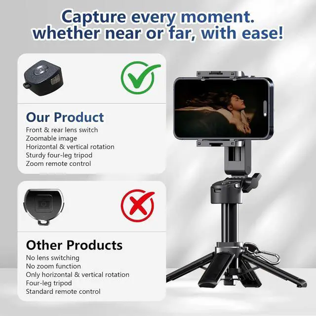 Dual-Mode Magnetic Head- 2-in-1 design with two options Strong magnetic suction for quick snap-on mounting or an extendable phone holder head for universal compatibility. Switch easily between modes to suit your needs. Stable Tripod & Extendable Design- Transforms from a handheld selfie stick into a stable tripod stand in seconds. The extendable shaft allows flexible height adjustment perfect for selfies group photos live streaming or video calls. Zoom & Remote Control- Equipped with a remote control that supports photo capture and zoom in/out functions from a distance making it easier to frame shots without touching your phone.
