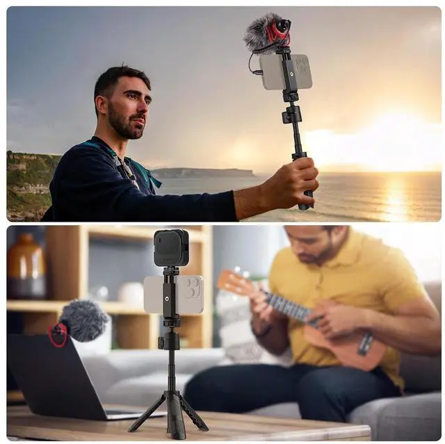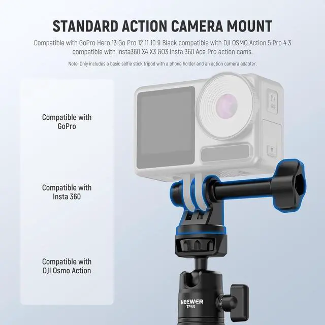 The non skid rubber feet provide a secure grip on any surface for stable shootingTripod for Phone & Action Camera The desktop selfie stick stand adjustable phone holder is compatible with iPhone 16 15 Pro Max Plus i Phone 14 Galaxy S25 S24 S23 Ultra Google Pixel 9 8 7 Pro Android mobile with one cold shoe for photography accessories or filming gears like a monitor fill light microphone. The mount adapter is compatible with GoPro Hero 13 Go Pro 12 11 10 Black compatible with DJI OSMO Action 5 Pro 4 3 compatible with Insta360 X5 X4 X3 GO 3S Insta 360 Ace Pro etc
