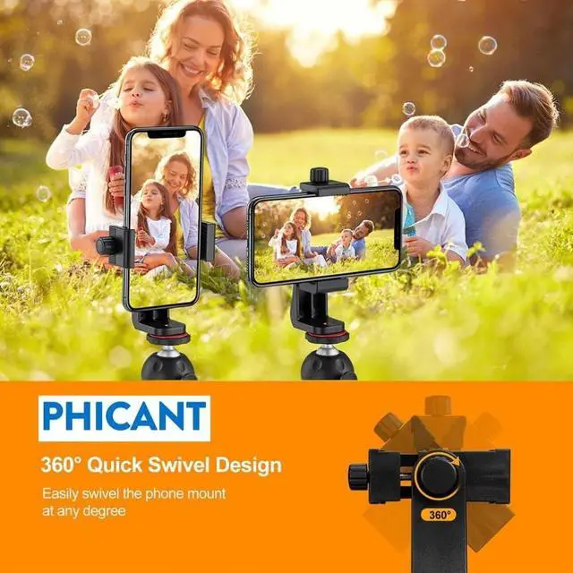 Easy Tripod Phone MountThe cell phone tripod mount features 3x 1/4 standard female screws which is perfect to mount it on any tripod monopod or selfie stick with a 1/4 standard male screw. Universal DesignThe smartphone tripod mount securely holds ANY SIZE cell phone even with a thick case. And tripod phone clamps width ranges from 2.2 inch to 4.1 inch wide enough for any cellphone. 360° Quick SwivelEasily swivel your phone 360° rotatable from portrait mode to landscape mode. The phone holder for tripod makes it more convenient to take photos make videos face-time chatting live streaming and so on.