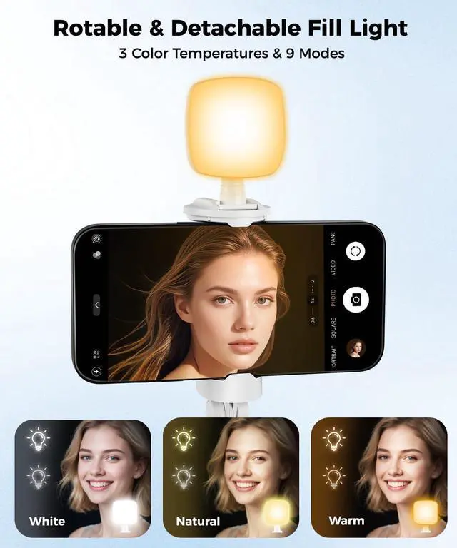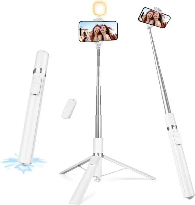 Auto-Open Phone TripodThe VICTIV phone tripod stand features a unique auto-pop design simply drop it vertically and the tripod legs spring open instantly. Compared with ordinary tripods no need to open the three legs manually saving time and easy to useSelfie Stick Tripod with Fill LightThis selfie stick tripod features a fill light (Rotable & Detachable). You can choose from 3-color modes (warm light neutral light cold light) to achieve the perfect lighting for any situation. Ideal for vlogging selfies vlogs live streaming etc68 Inches Extendable Cell Phone TripodThis adjustable tripod for phone features a 8-section telescopic pole with a maximum height of 68/172cm its made of aluminum alloy so the iphone tripod is not only lightweight but also sturdy.