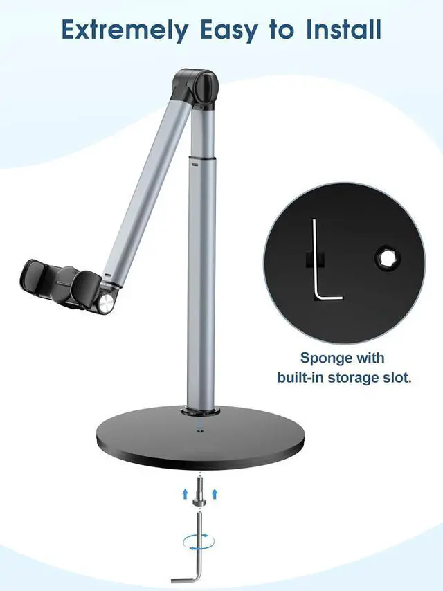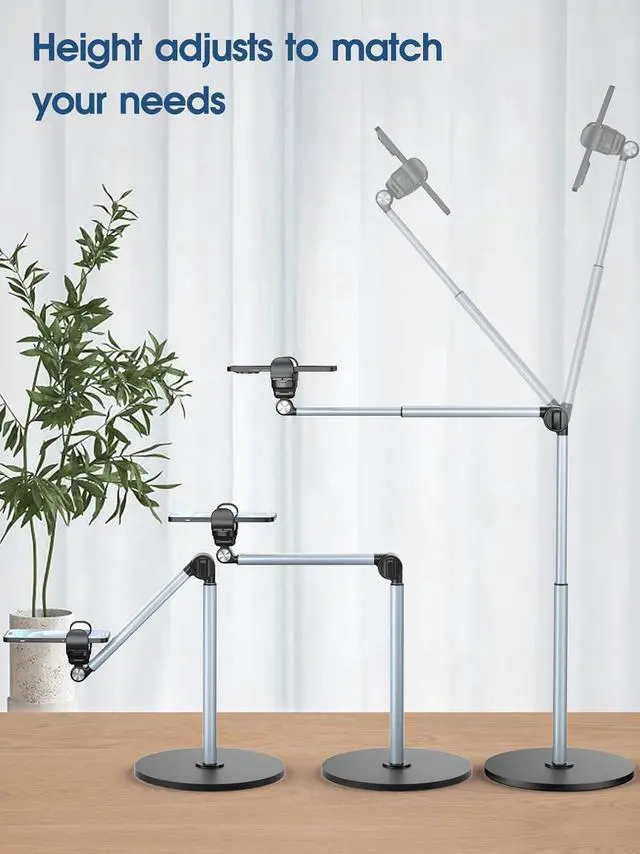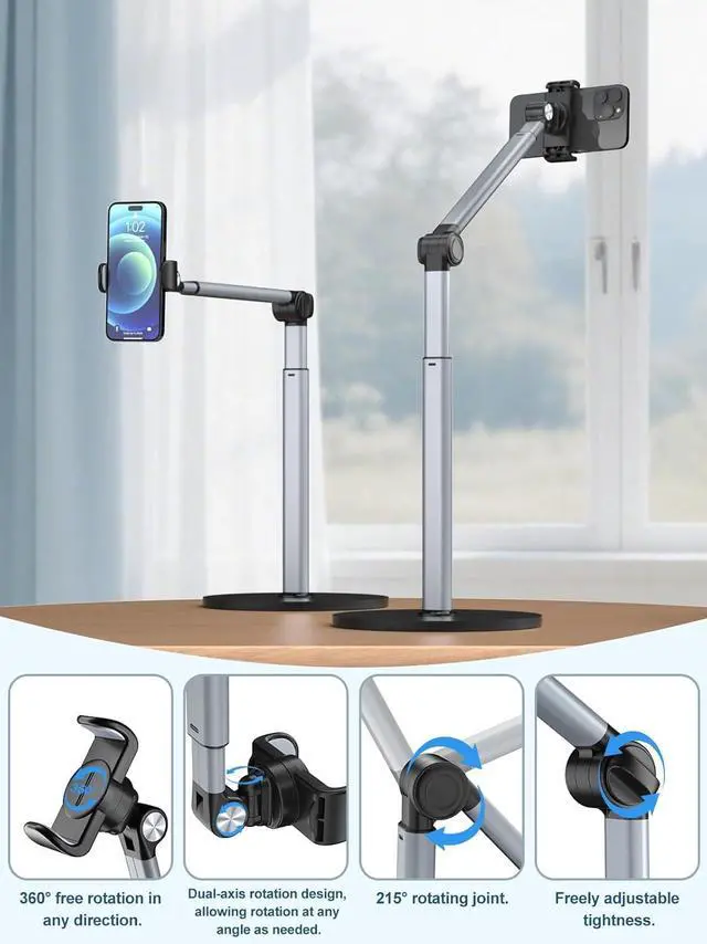 Sturdy Overhead Phone Mount for Stable RecordingThis overhead phone stand features a heavy-duty aluminum build with a weighted base to keep your device stable while recording even when fully extended at 90°. Perfect as a cooking phone holder for recording overhead it holds your phone securely for steady videos and photos without shaking. Extra-Long Flexible ArmFeatures a 12.3 -inch retractable arm that adjusts up and down bends 180° and rotates 360° for the perfect angle. Easily capture overhead cooking videos painting or piano tutorials without hassle. Fully Adjustable Overhead Phone Tripod for Flexible AnglesDesigned as an overhead tripod for iPhone and overhead phone tripod this stand adjustable height and flexible angles to capture the perfect overhead shots for art baking crafting or unboxing videos with ease.