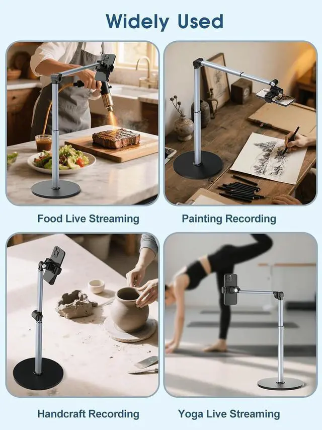 Perfect for Creators & WorkspacesWhether youre live streaming drawing cooking recording piano or scanning documents this overhead phone stand for recording is your reliable creative companion for your workspace studio and kitchen. Sleek Design with High Compatibility and Easy SetupThis overhead iPhone mount is compatible with most smartphones and is easy to set up for any tripod for overhead shots needs. Featuring premium build quality it combines stability versatility and a sleek look to enhance your recording and working space.