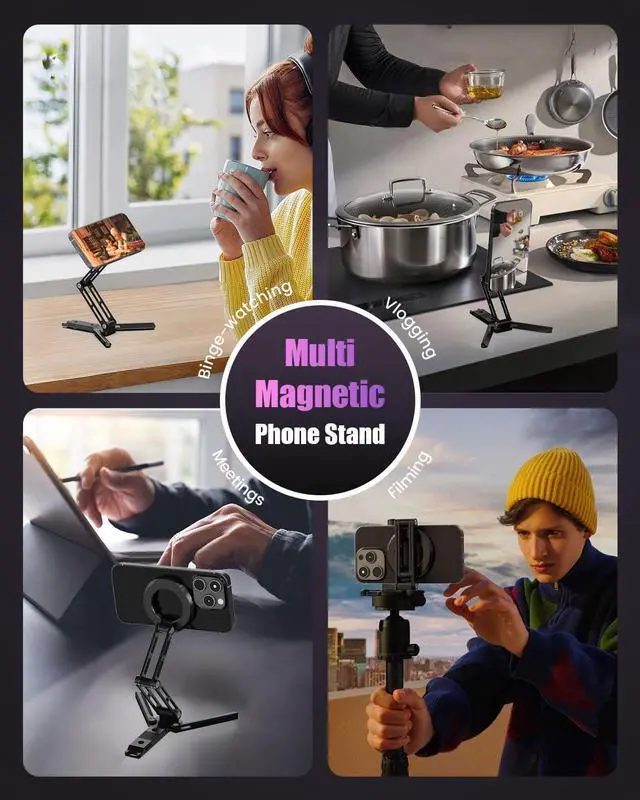 A versatile Magsafe tripod designed specifically for creators. Flexible Angles & Steady BaseMulti-joint foldable arm allows flexible tilt and height adjustments. Supports portrait and landscape orientation. Anti-slip silicone base keeps the magnetic phone tripod stand stable on any surface. Folds flat for portability. Reliable For Everyday Use Your reliable mini magsafe tripod mount at home at work or on the move. Ideal for creators vloggers FaceTime nightstand use desk viewing and entertainment lovers alike. Includes hex wrenches to easily re-tighten joints after long-term use.
