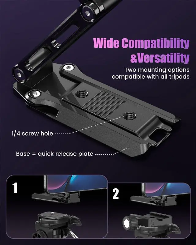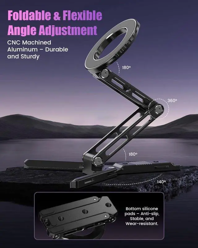 Powerful Magnetic GripThis magnetic phone stand uses a high-strength MagSafe module to securely attach iPhone 12 & newer series. Includes 2 magnetic rings for Android and non-MagSafe phones. Switch easily between portrait and landscape for hands-free calls or streaming. Lightweight & CNC-Machined QualityCNC-machined from solid aluminum for durability and premium feel. Weighs only 3.95 oz and folds to 0.99 slimpocket-sized for travel vlogging or daily carry. A portable magnetic phone tripod you can take anywhere. Compatible with the Arca-Swiss Quick Release SystemEquipped with a 1/4-inch screw hole. It can be easily mounted on tripod heads or camera armseither screwed in as a quick-release plate or slid onto the head for fast and secure installation.