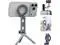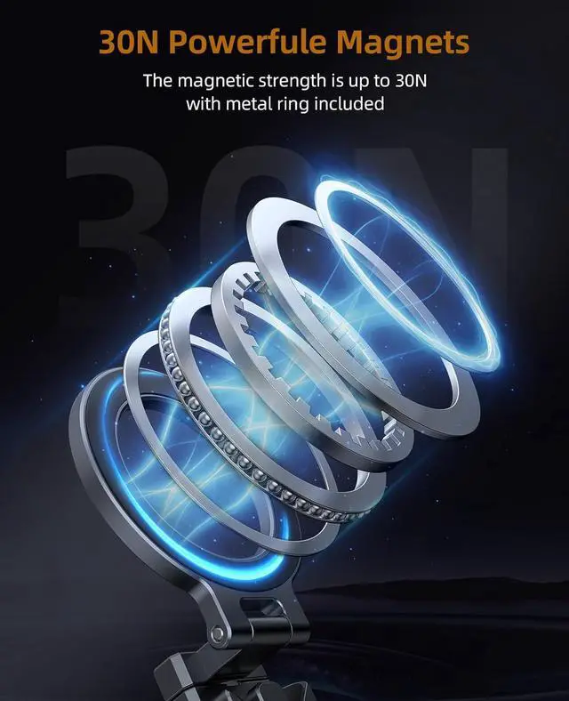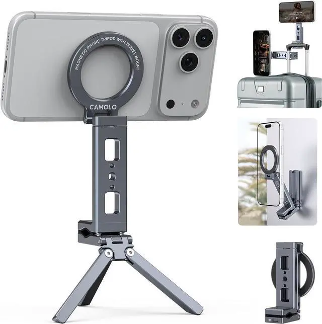 You can use it on a selfie stick for selfies or on a tripod for shooting or recording. An additional 1/4 thread on the arm allows easy attachment of accessories like microphones or lights making it an all-in-one solution for demanding creators. Wide CompatibilityThe magnetic phone tripod works with iPhone 17/16/15/14/13/12 Pro Max/17 Air series and other smartphones supporting wireless charging. If your phone or case does not have Mag Safe function you can stick the metal ring (included in the package) on the back of the phone or case to achieve strong magnetism. Compact & PortableThe magnetic phone stand is smaller than a mobile phone when fully folded convenient folding design allows you to carry it with you suitable for travelling.