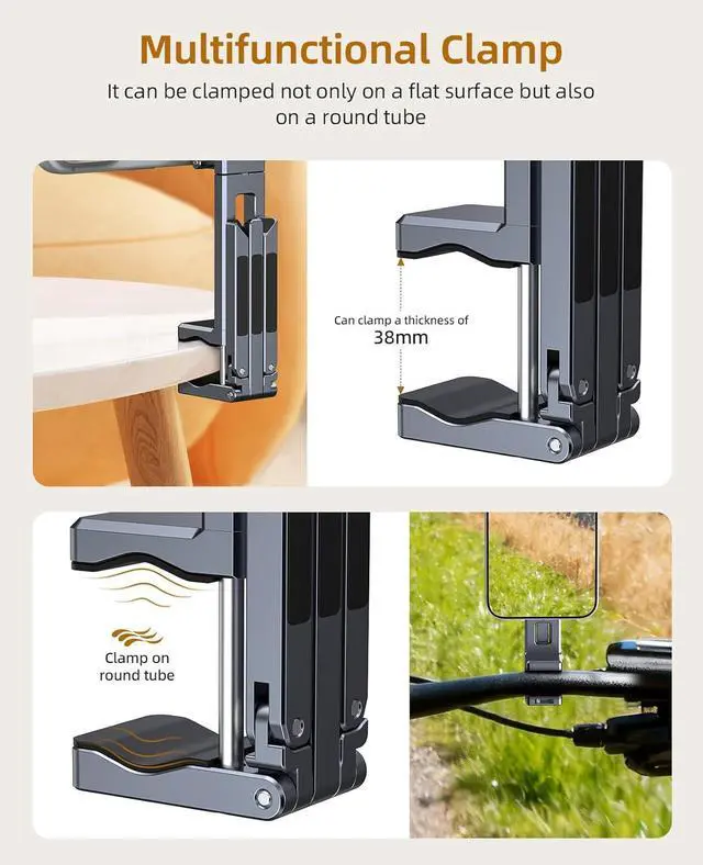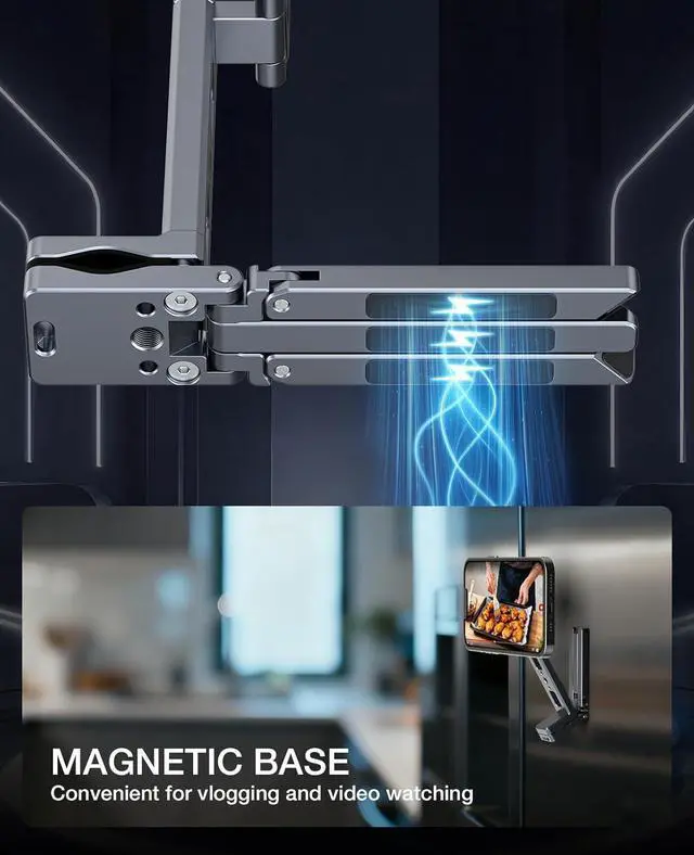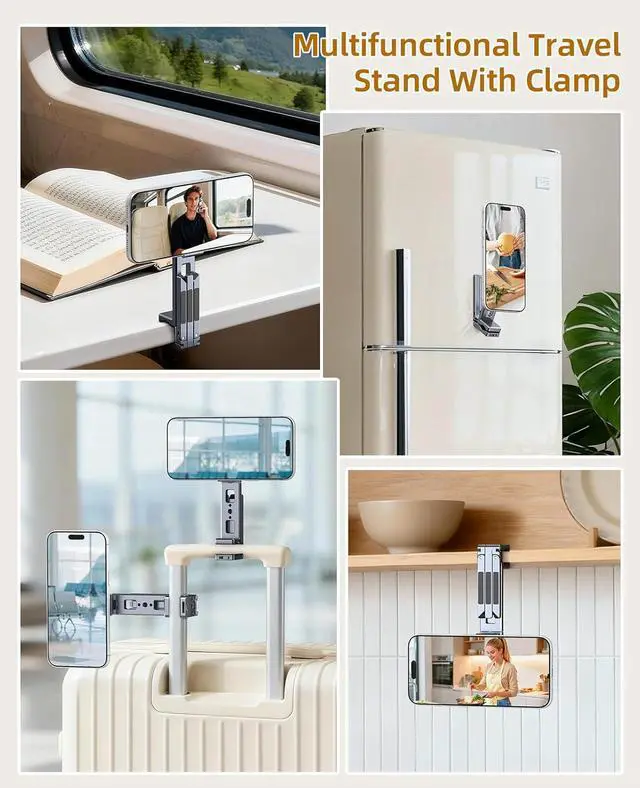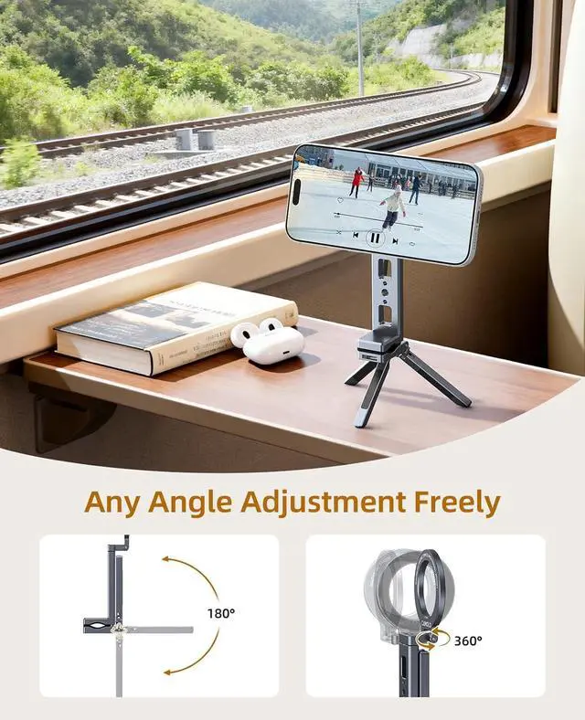 You can also clip it onto a kitchen cabinet to view cooking tutorials or take notes while cooking. Free-Angle AdjustmentThis cell phone selfie stick Easily switch between landscape and portrait modes without interrupting your content. This precise control enables a variety of shots from overhead to low-angle and portrait. As a cell phone stand it is also improve posture and reduce neck strain; its magnetic ring then enables seamless 360° rotation for quick orientation changes. Multi-functional ExpansionThis mini tripod for iPhone is engineered for versatility 1/4 screw mounts to integrate seamlessly into any professional setup.