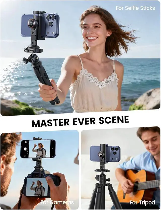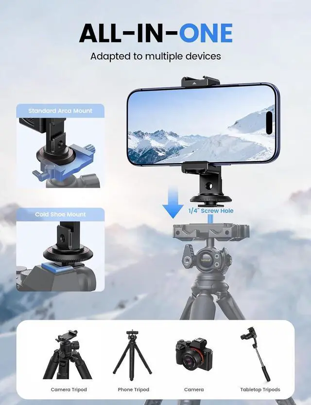 Baseplate: This innovative tripod phone mount integrates standard Arca quick-release 1/4 screw and cold shoe interfaces in one base. It seamlessly connects to cameras tripods selfie sticks sliders and more meeting all your needs from static setups and videography to adding accessories so you can focus on creating.