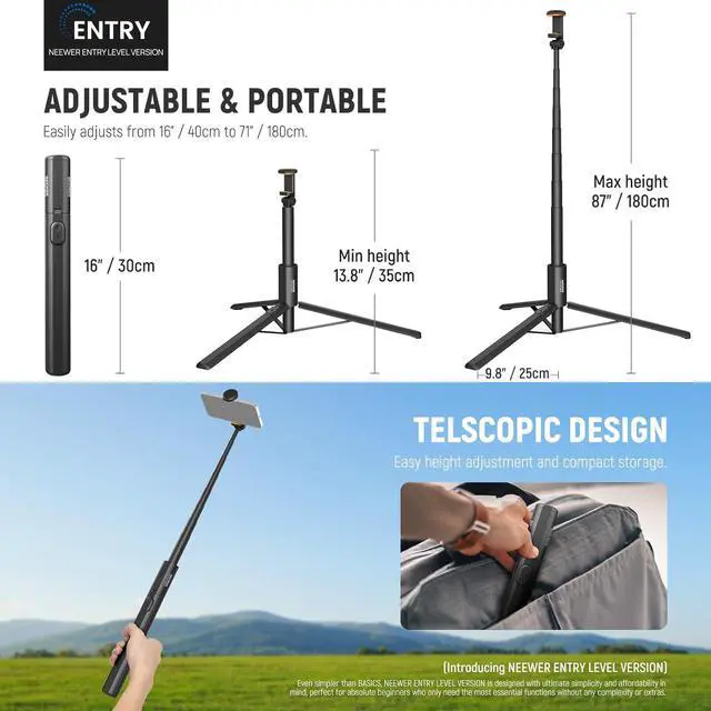 Introducing NEEWER ENTRY LEVEL VERSIONEven simpler than BASICS NEEWER ENTRY LEVEL VERSION is designed with ultimate simplicity and affordability in mind perfect for absolute beginners who only need the most essential functions without any complexity or extras. The PA988 combines a portable selfie stick and a stable phone tripod into one to meet various shooting scenarios. Weighing only 12.4 oz (350g) and measuring 13.5 (34cm) when folded its easy to carry and storeUp to 71 Height with 180° Tilt Extending from 16-71/40-180cm the PA988 phone camera holder tripod stand supports shooting from low angle eye level to overhead perspectives ensuring a broader field of view when used as a handheld selfie stick compatible with iPhone.
