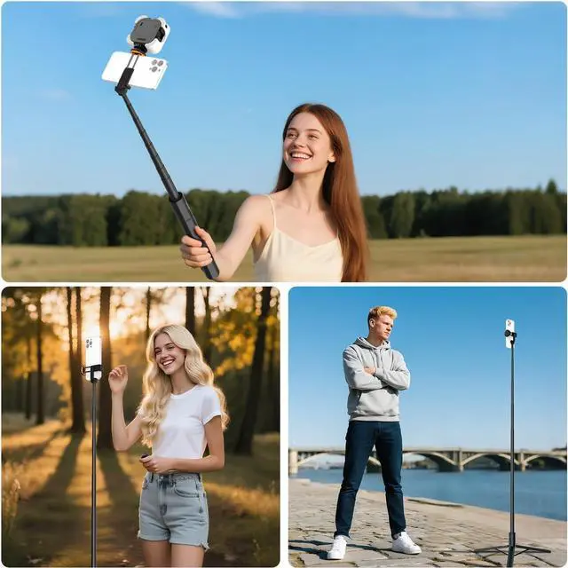 The phone holder tilts 180° back and forth for flexible capture angles. Ideal for YouTube TikTok vlogging selfies vlogs group shots golf or gym video recording travel film creations live streaming etcRechargeable Bluetooth Remote Includes a detachable remote control stored in the base that effortlessly connects to your smartphone via Bluetooth enabling wireless one touch shutter control and eliminating the hassle of reaching for your phone screen or setting a timer ideal for group selfies and family gathering. After use snap it back into the base to prevent lossCompact Selfie Stick Tripod for Phones & Cameras The tall standing tri pod stand with a cellphone holder as photography accessories is compatible with iPhone 16 Max Plus i Phone 15 14 Android Galaxy S25 S24 Ultra and other popular smartphones.