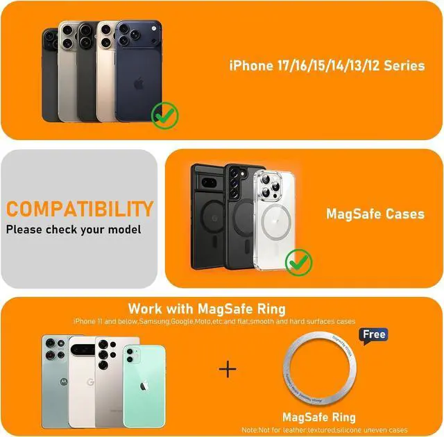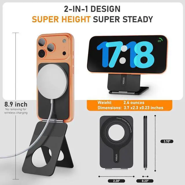 Wireless Charger stand: The phone tripod has built-in strong magnets. Mag-safe phone stand compatible with the Original Mag-Safe Charger. Super magnetic properties can improve wireless charging efficiency. Mag-safe charger is also quite easy to attach and detach your phone from the mag charging standConvenient and