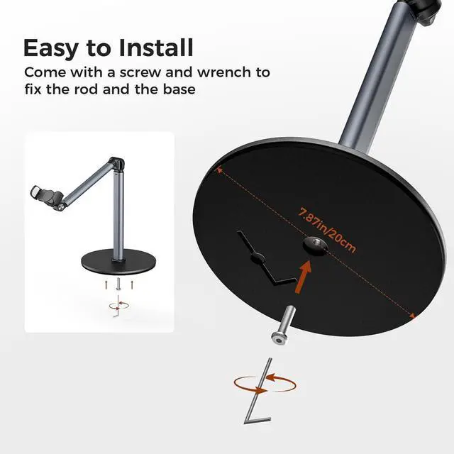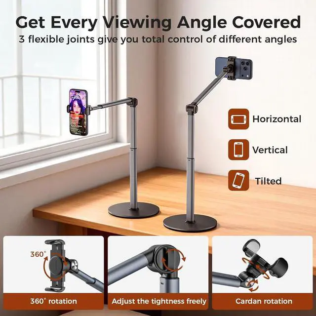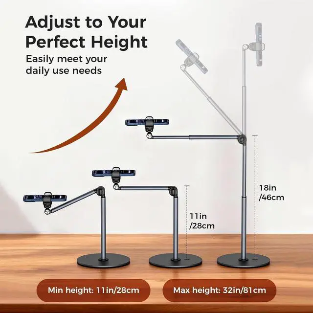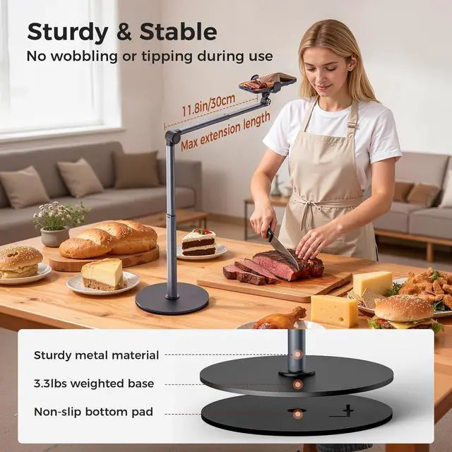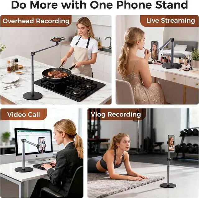 Extended Reach: The telescopic arm extends up to 13.7 inches and can be adjusted up and down as well as rotated 360°. It is perfect for overhead shots angled views or even close-up setups. The overhead phone stand allows you to capture perfect shots for vlogs vertical TikTok videos or overhead cooking demonstrations without having to move the entire stand.
